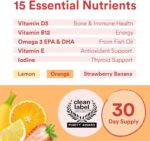 • 15 essential nutrients: vitamin D3 for bone & immune health, vitamin B12 (methylcobalamin) for energy, omega-3 EPA & DHA (from fish oil), vitamin E (from sunflower oil) for antioxidant support and iodine for thyroid support.*